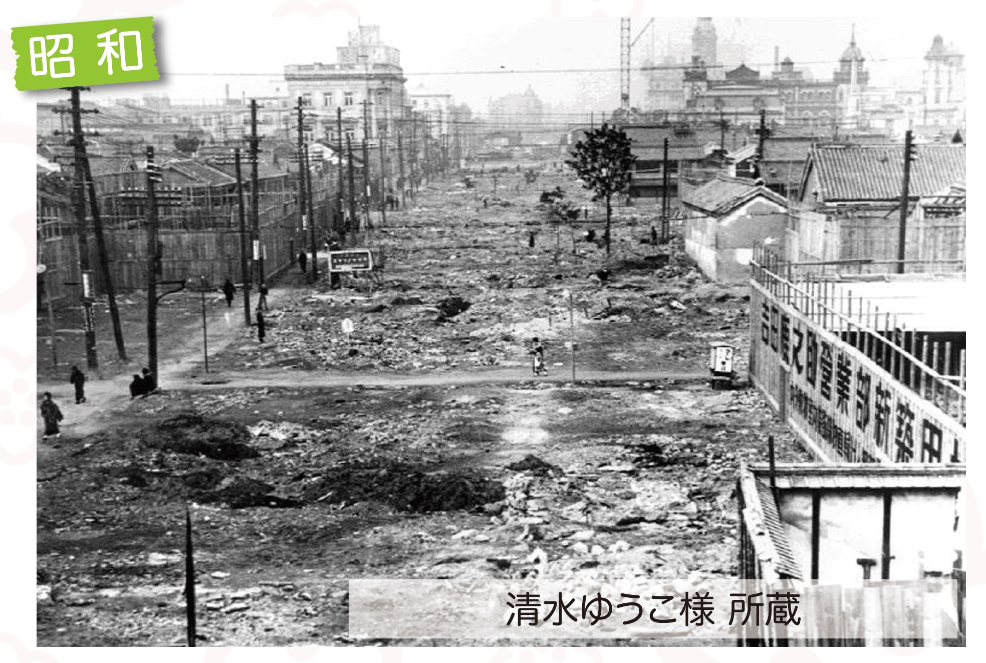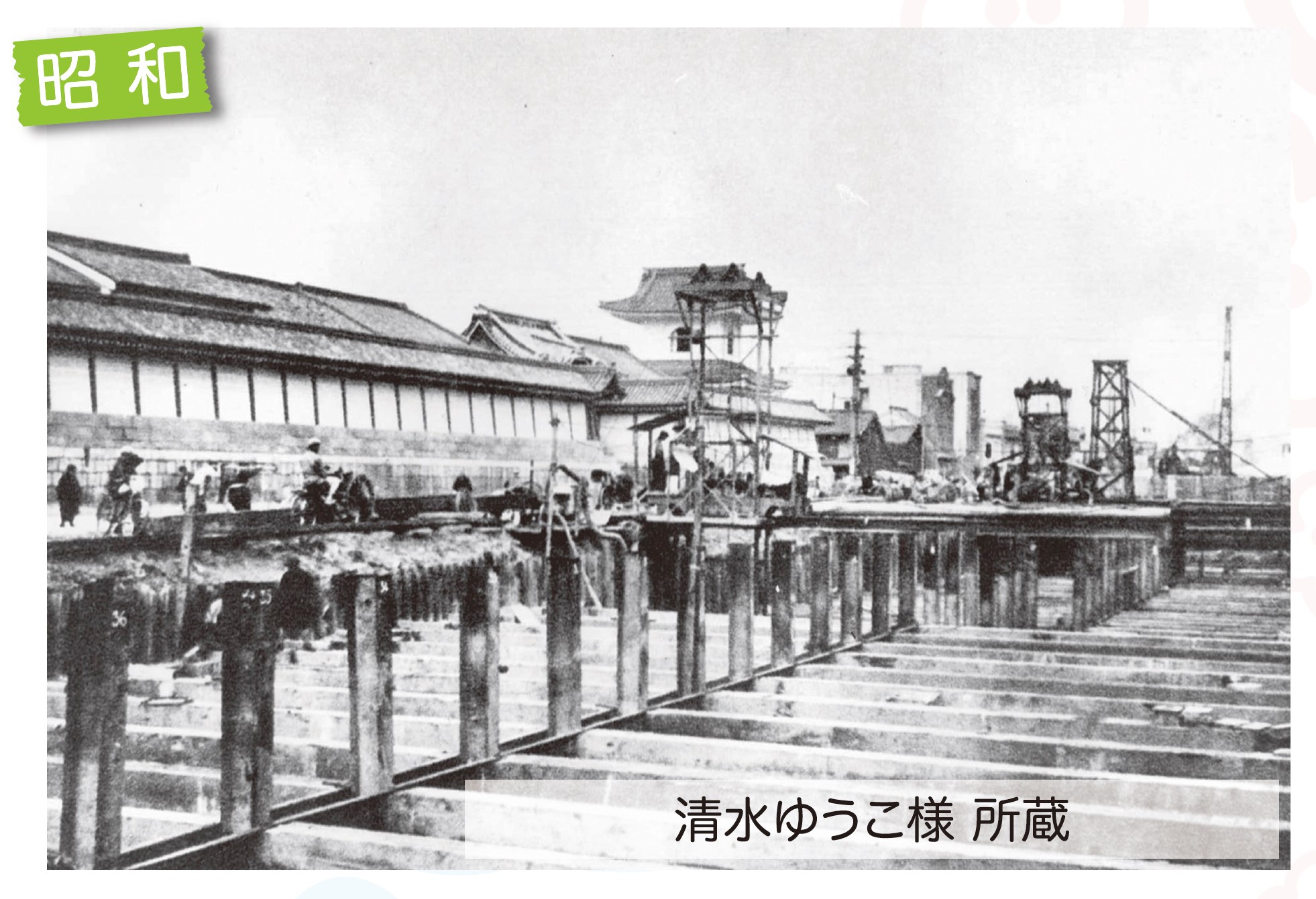 当時は大坂城へと続く東西の「通り」が主要動線で、御堂筋も賑やかな筋ではあったものの、幅約6mととても狭い道路でした。明治期にも東西の「通り」が交通の中心でしたが、やがて梅田と難波に駅ができると、南北軸の必要性が高まってきました。昭和5(1930)年に着工した御堂筋の拡幅工事は長期に渡る難工事の末、昭和12(1937)年に開通しました。