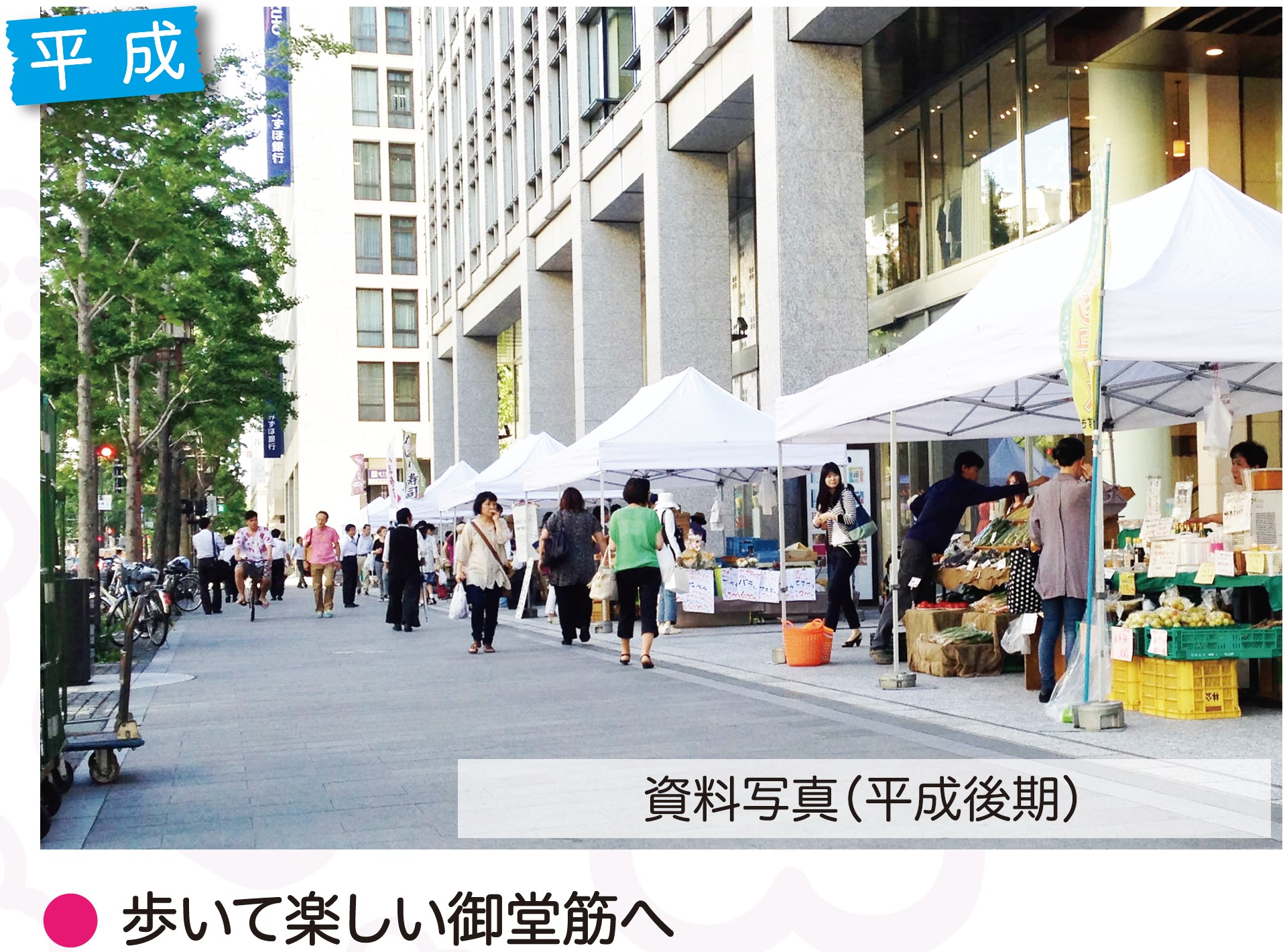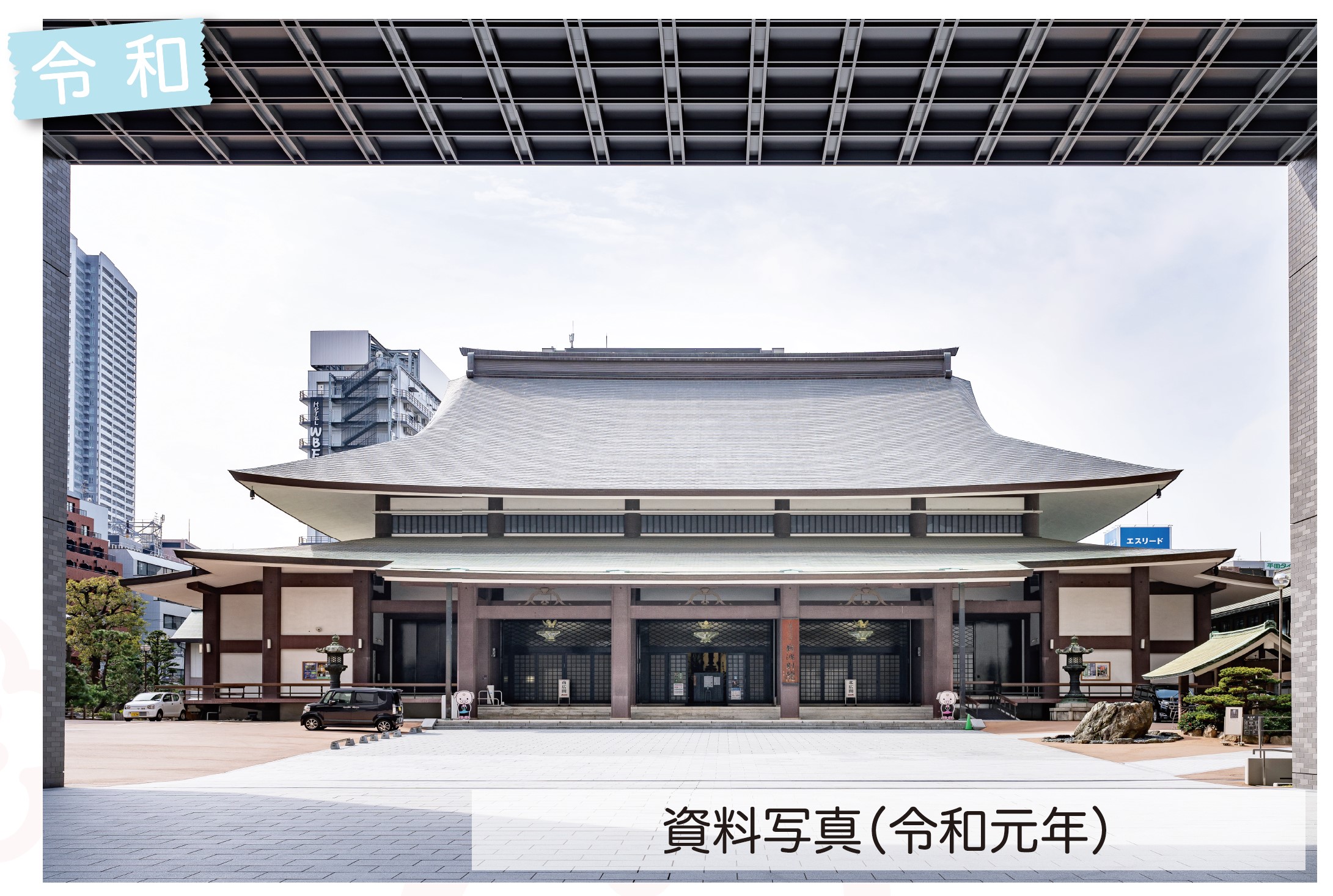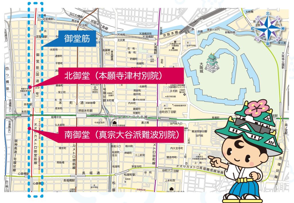 豊臣秀吉は、本願寺を大谷派(東)と本願寺派(西)に分立させたため、大谷派は難波別院、本願寺派は津村別院を建立。御堂筋の名称は、2つの別院(御堂)の正面を南北に通じたことによります。