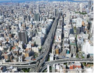 豊臣秀吉による大坂城築城・大坂城下の開発時、西に位置する本事業地「船場」は、町人(商人)の移転先として開発されました。以降、「秀吉が築き、徳川が育んだ商都」と呼ばれ、物流の拠点を担う商人文化根付く市街地で、近世の時代から大阪を代表する中心地として発展しています。南北約2km、東西約1kmの碁盤の目の町割りで整備され、御堂筋や堺筋が南北に通じ、東端は東横堀川・西端は旧横堀(阪神高速)・南端は長堀通・北端は土佐堀川に囲まれた四角形の地です。