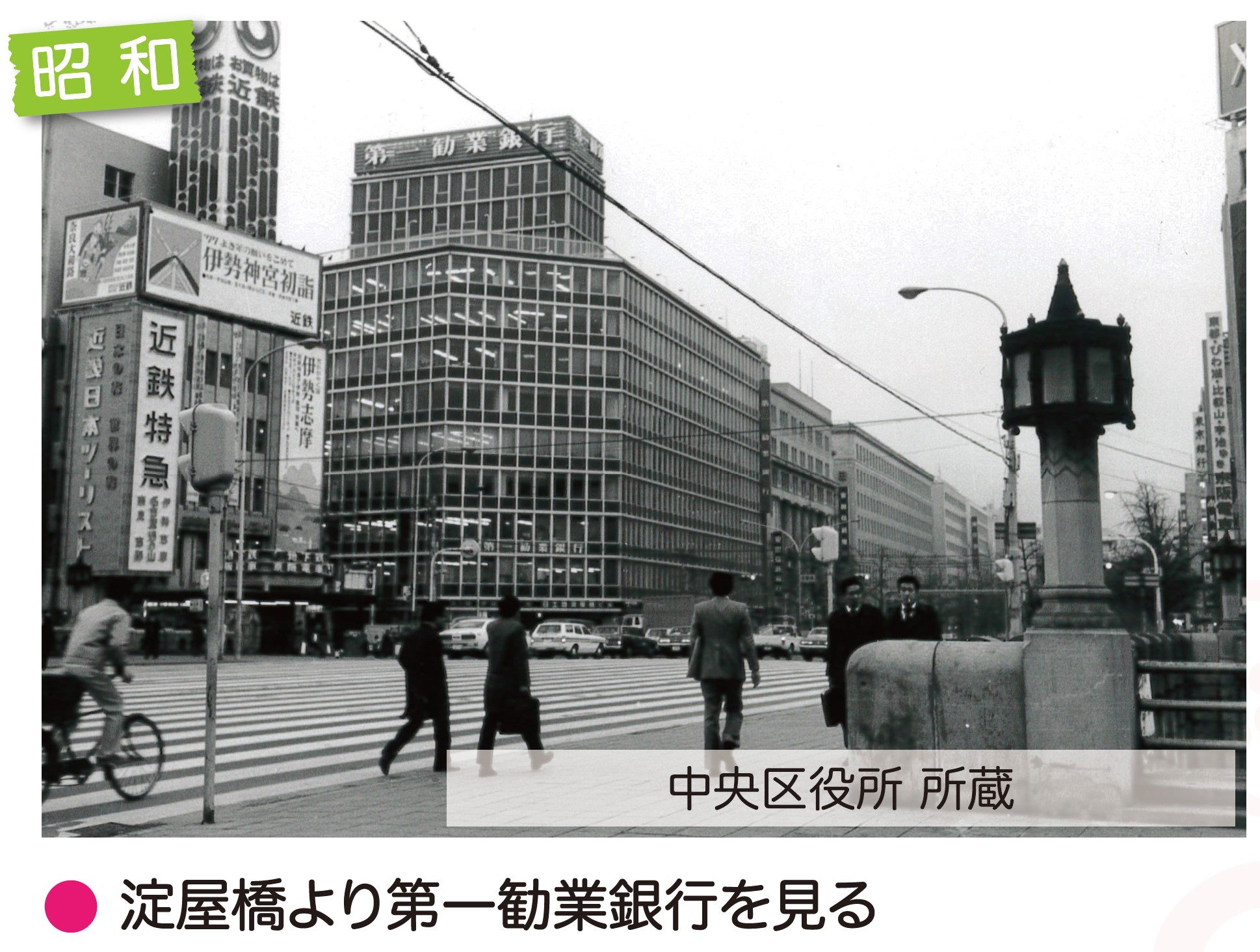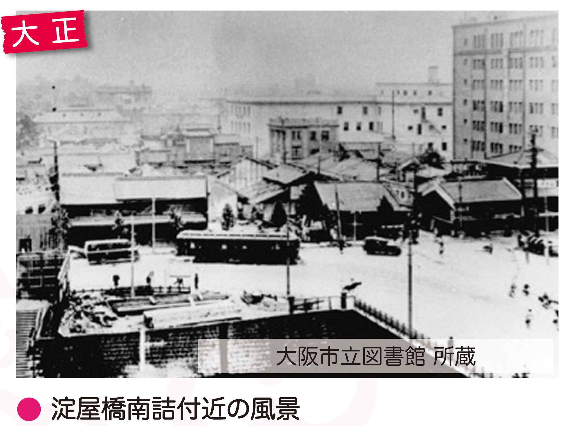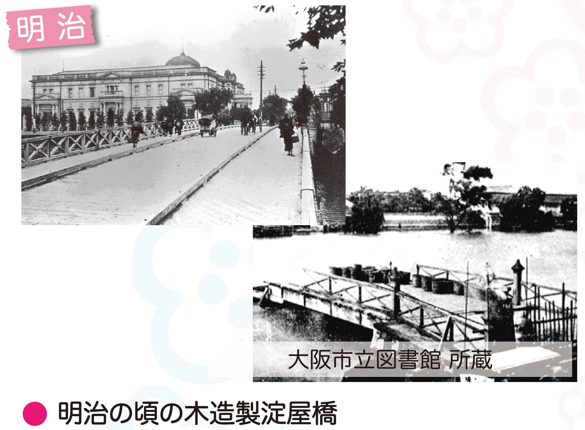 淀屋橋は明治に入り大洪水によって流失し架け替え、さらに市電堺筋線の建設に伴い、明治44(1911)年に再度架け替えられました。現在の橋は昭和10(1935)年に御堂筋の建設に伴い架けられたコンクリート・アーチ橋で、平成20(2008)年に国の重要文化財に指定されています。